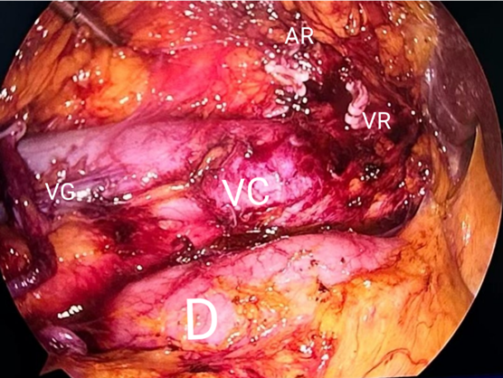 VG: vena gonadal, D: duodeno, VC: vena cava, AR: arteria renal, VR: vena renal.