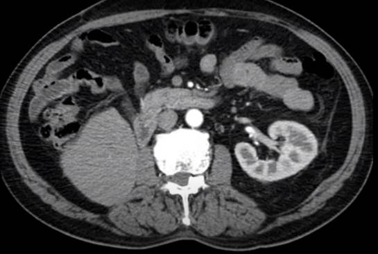 Unidad renal derecha con imagen sugerente de tumoración piélica derecha que se extiende por uréter ipsilateral (flecha blanca delgada).