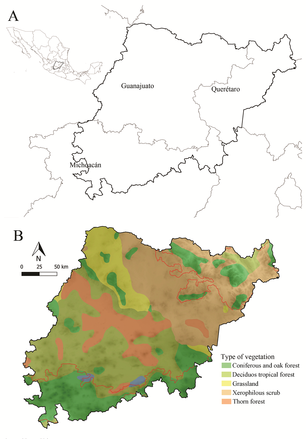 Study area. The Flora of Bajío includes that found in the states of Guanajuato and Querétaro in its entirety (46 and 18 municipalities respectively) and the northeastern part of the state of Michoacán (53 municipalities), delimited by the areas located east of the meridian 102° 10 ' W (Figure 1A, Villaseñor & Ortíz 2012). Xerophilous scrub has been recorded in large areas in the municipalities of San Luis de la Paz, Santa Catarina and Victoria in Guanajuato (Figure 2A, Rzedowski & Galván 1996). In Querétaro, this vegetation extends into the municipalities of Tolimán, Peñamiller and Cadereyta de Montes (Figures 1B and 2B, Rzedowski et al. 2012). The xerophilous scrub is found mainly in the Chihuahuan Desert, but also extends into areas within the Trans-Mexican Volcanic Belt in the foothills near Morelia, Michoacán (Contreras & Silva 2020). Deciduous tropical forests are present in Querétaro and Guanajuato; in the first cover the municipalities of Jalpan and Landa, but isolated patches have been also recorded in Tequisquiapan, San Juan del Río and Querétaro (Figures 1B and 2C, Zamudio et al. 1992). In Guanajuato, this vegetation type has been observed in the ravines of the municipalities of Xichú, Atarjea and Victoria, which correspond to Sierra Gorda, which is part of the Sierra Madre Oriental, as well as some remnants toward the central area of the state (Figures 1B, 3A, and 3B, Rzedowski & Galván 1996, Zamudio 2012, Rzedowski & Calderón 2013). The thorn forests extend into the municipalities of San Juan del Río, Pedro Escobedo and Querétaro. In addition, there is a strip of thorn forests that extends toward the states of Guanajuato and parts of Michoacán, surrounding the Trans-Mexican Volcanic Belt (Figure 1B, Rzedowski 2006, Zamudio 2012). The Quercus forests, associated or not associated with conifers, such as Pinus and Abies, are distributed in Guanajuato on the Sierra Gorda, Sierra de Pénjamo and Agustinos; (Figures 1B and 3C, Zamudio 2012). In Querétaro, this type of vegetation is distributed toward the mountain ranges of Pinal de Amoles, San Joaquín, Arroyo Seco, Jalpan and Landa, extending toward Guanajuato in the municipalities of Xichú and Atarjea. Overall, the floristic composition indicates the influence of the Sierra Madre Oriental (Argüelles et al. 1991, Rzedowski et al. 2012, Zamudio 2012). Quercus and Pinus forests have been recorded to a lesser extent toward Amealco, which includes the Sierra del Rincón, whose extension reaches the northern part of Michoacán (Cabrera-Luna et al. 2015). The grassland is located in a small strip within the municipalities of San Juan del Río (Chihuahuan Desert), as well as in Amealco and Huimilpan (Trans-Mexican Volcanic Belt), although in some cases, the grassland was likely induced (Figure 3D, Zamudio et al. 1992).