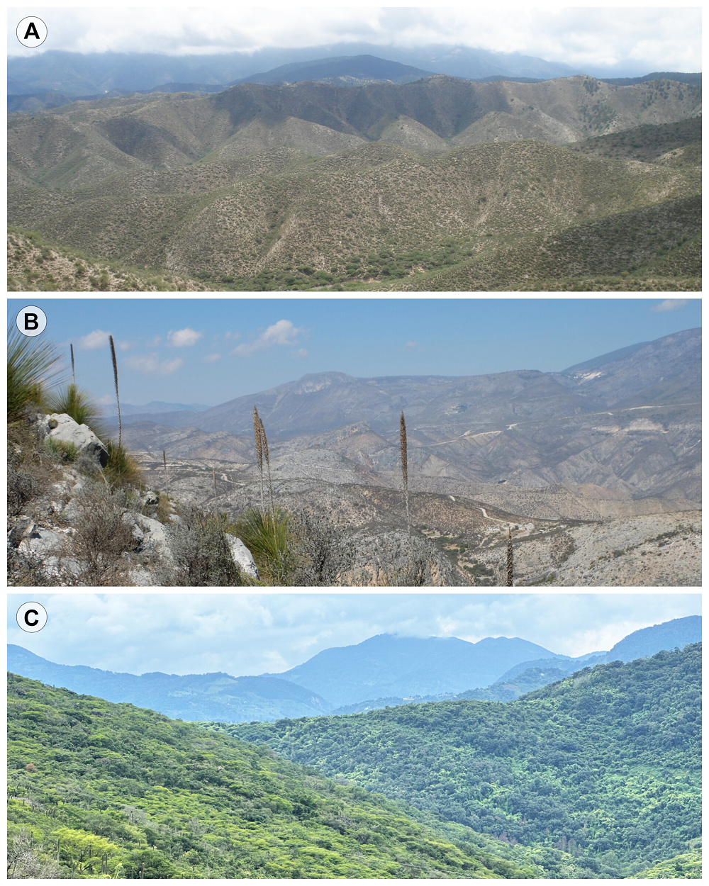 Figure 2 Vegetation types in the Bajío and adjacent regions. A. Xerophilous scrub in Atarjea, Gto., and B. Cadereyta de Montes, Qro. C. Tropical deciduous forest in Jalpan, Qro.