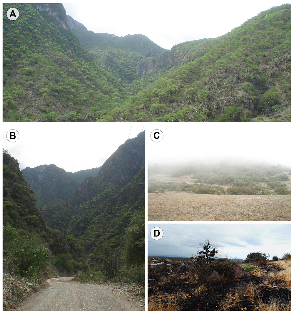 Figure 3 Vegetation types. A, B. Tropical deciduous forest in Xichú, Gto. C. Secondary grassland with Quercus forest in the background in Santa Catarina, Gto. D. Xerophilous scrub disturbed to induce grasslands in San José Iturbide, Gto.