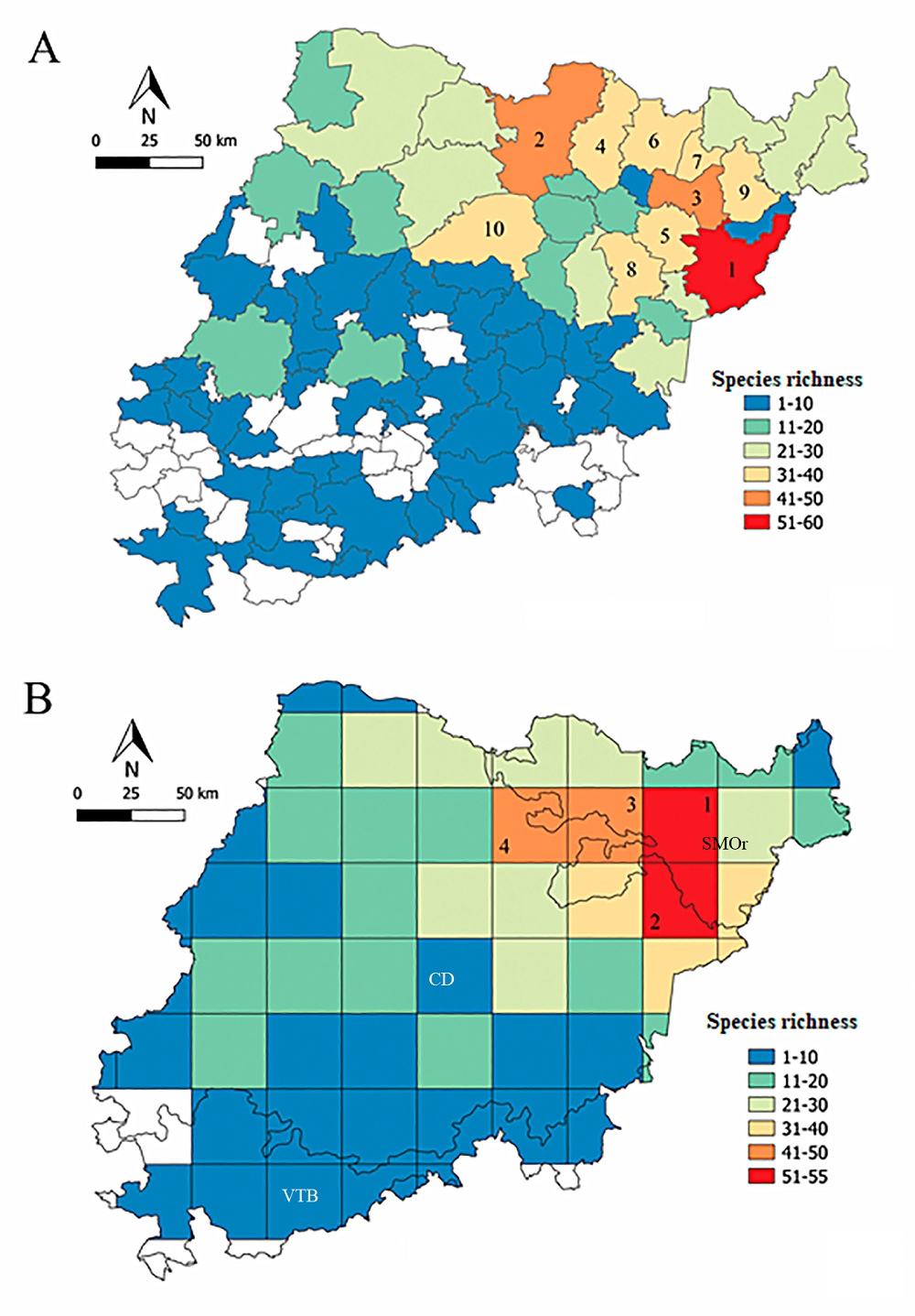 Figure 4 Richness of cactus species in the Bajío and adjacent regions. A. Municipal political division. 1: Cadereyta de Montes; 2: San Luis de la Paz; 3: Peñamiller; 4: Victoria; 5: Tolimán; 6: Xichú; 7: Atarjea; 8: Colón; 9: Pinal de Amoles; 10: San Miguel de Allende. B. Species richness by cell; the regions delimited within the study area represent the VTB, CD and SMOr.