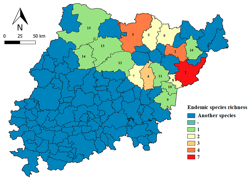 At the municipal level, Cadereyta de Montes hosted the greatest number of endemic species, with seven species, followed by Peñamiller, with four species. A second center of endemism was San Luis de la Paz, with four species, while the neighboring municipalities, i.e., Victoria and Xichú, each hosted 2 endemic species (Figure 5). The municipalities of El Marqués and Querétaro hosted 3 and 2 species, respectively. Finally, the municipalities of San Juan del Río, Tequisquiapan, Colón, Pinal de Amoles, San Miguel de Allende, Dolores Hidalgo, Guanajuato and San Felipe, hosted only one endemic species within their perimeters (Figure 5).