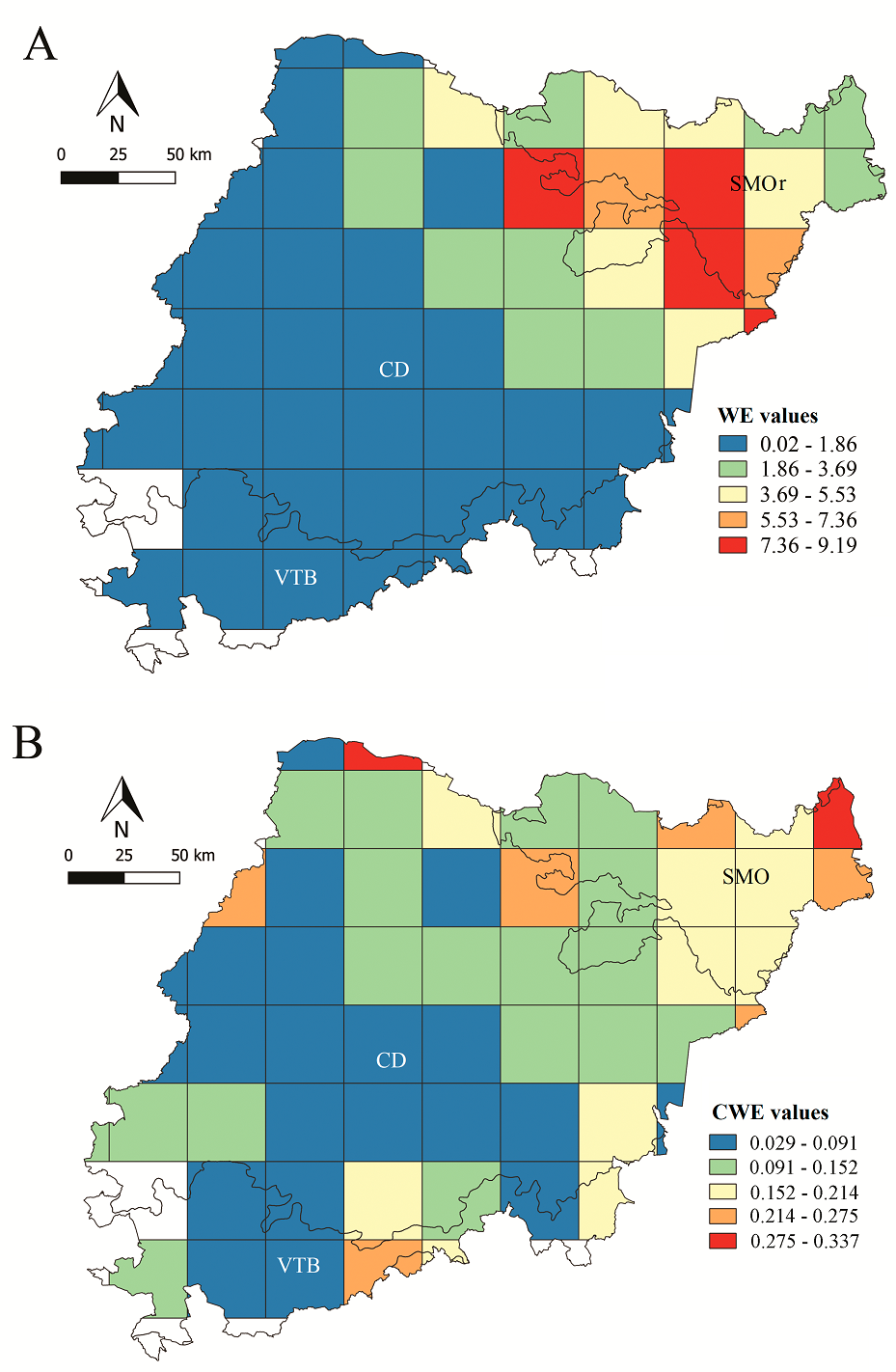 The CWE shows cells with high values at the northern and southern ends of the study area because it recovers species that are found only in that cell and not in others; however, these taxa are common in regions outside the study polygon; for example, Rhipsalis baccifera (Sol.) Stearn and Selenicereus spinulosus (DC.) Britton & Rose at the northern end and S. ocamponis were distributed in a single quadrant at the southern end (Figure 3B).
