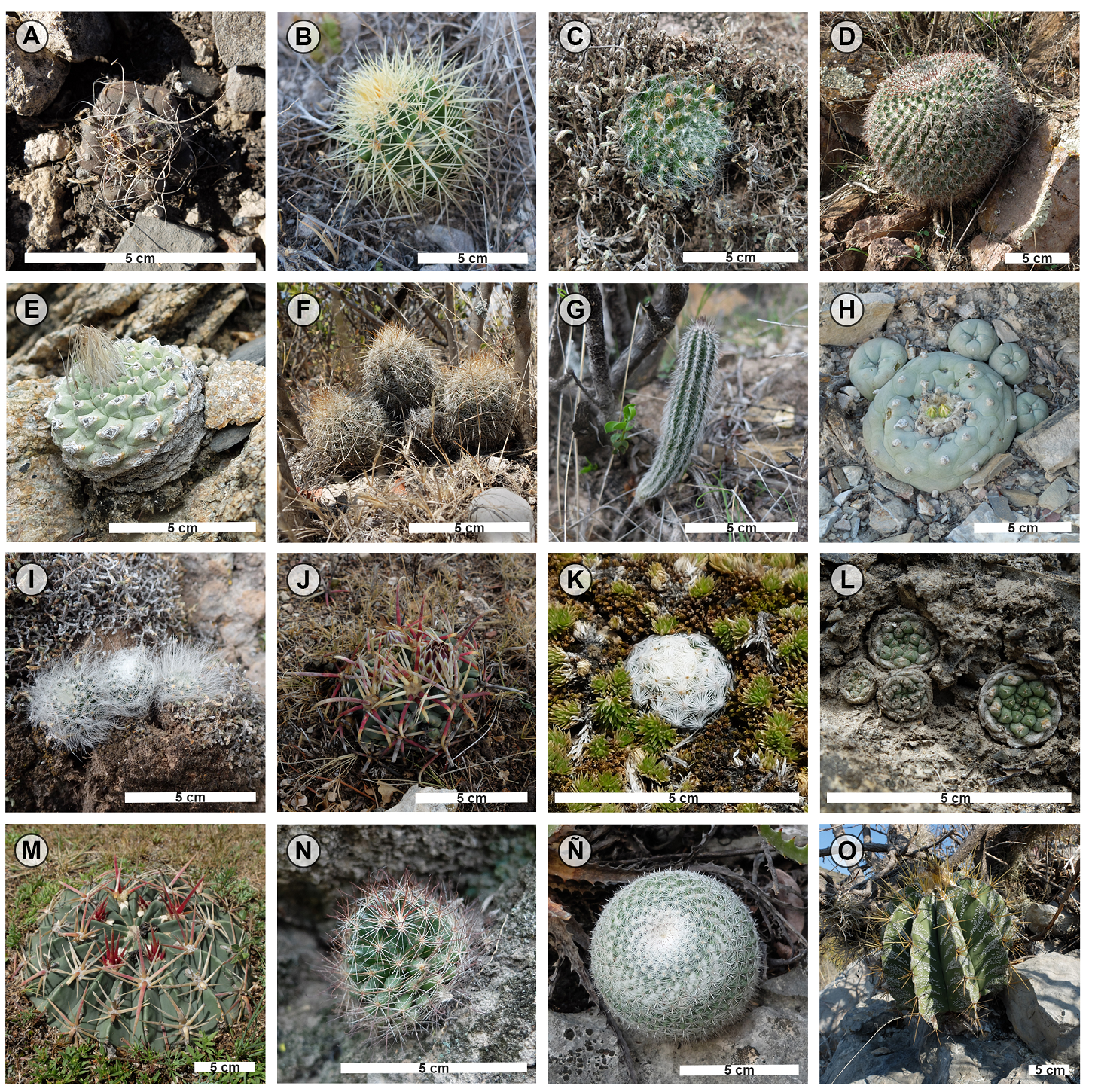 Figure 7 Some Cactaceae representative in the Bajío and adjacent regions. A. Kadenicarpus pseudomacrochele (D. Aquino & M. Vázquez-Sánchez 572 (MEXU)). B. Kroenleinia grusonii (R. Ortega s. n. (MEXU)). C. Mammillaria monochrysacantha (P. González-Zamora et al. 84 (IBUG, IEB)). D. M. ariasii (D. Aquino et al. 510 (MEXU, IBUG)). E. Strombocactus disciformis (D. Aquino & P. González-Zamora 547 (MEXU)). F. Thelocactus hastifer (S. Arias & D. Aquino 2263 (MEXU)). G. Echinocereus schmollii (D. Aquino & P. González-Zamora 550 (MEXU)). H. Lophophora diffusa (S. Arias & T. Terrazas 1698 (MEXU)). I. M. scheinvariana (D. Sánchez & A. Martínez-Poiré 884 (IBUG)). J. Ferocactus mathssonii (S. Arias & T. Terrazas 1688 (MEXU)). K. M. albiflora (D. Aquino et al. 506 (MEXU)). L. Strombocactus disciformis subsp. esperanzae (D. Aquino et al. 524 (MEXU)). M. F. macrodiscus subsp. septentrionalis (D. Aquino et al. 364 (MEXU)). N. M. mathildae (D. Aquino & P. González-Zamora 553 (MEXU)). Ñ. M. hahniana (D. Aquino et al. 522 (MEXU)). O. Astrophytum ornatum (D. Aquino et al. 517 (MEXU)).