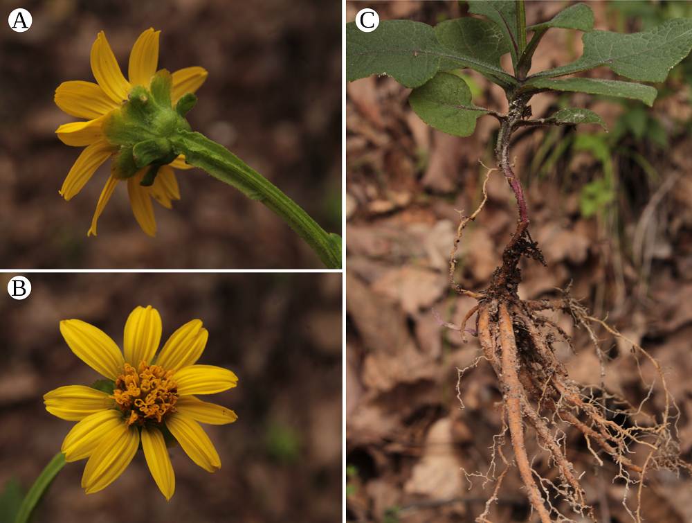 Figura 2 Verbesina bernalii Art.Castro & L.F.Colin-Nolasco. A-B) Vistas de los capítulos en distintos ángulos. C) Detalle de las raíces engrosadas. Fotografías de Arturo Castro Castro.