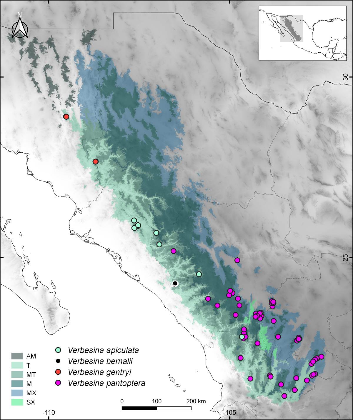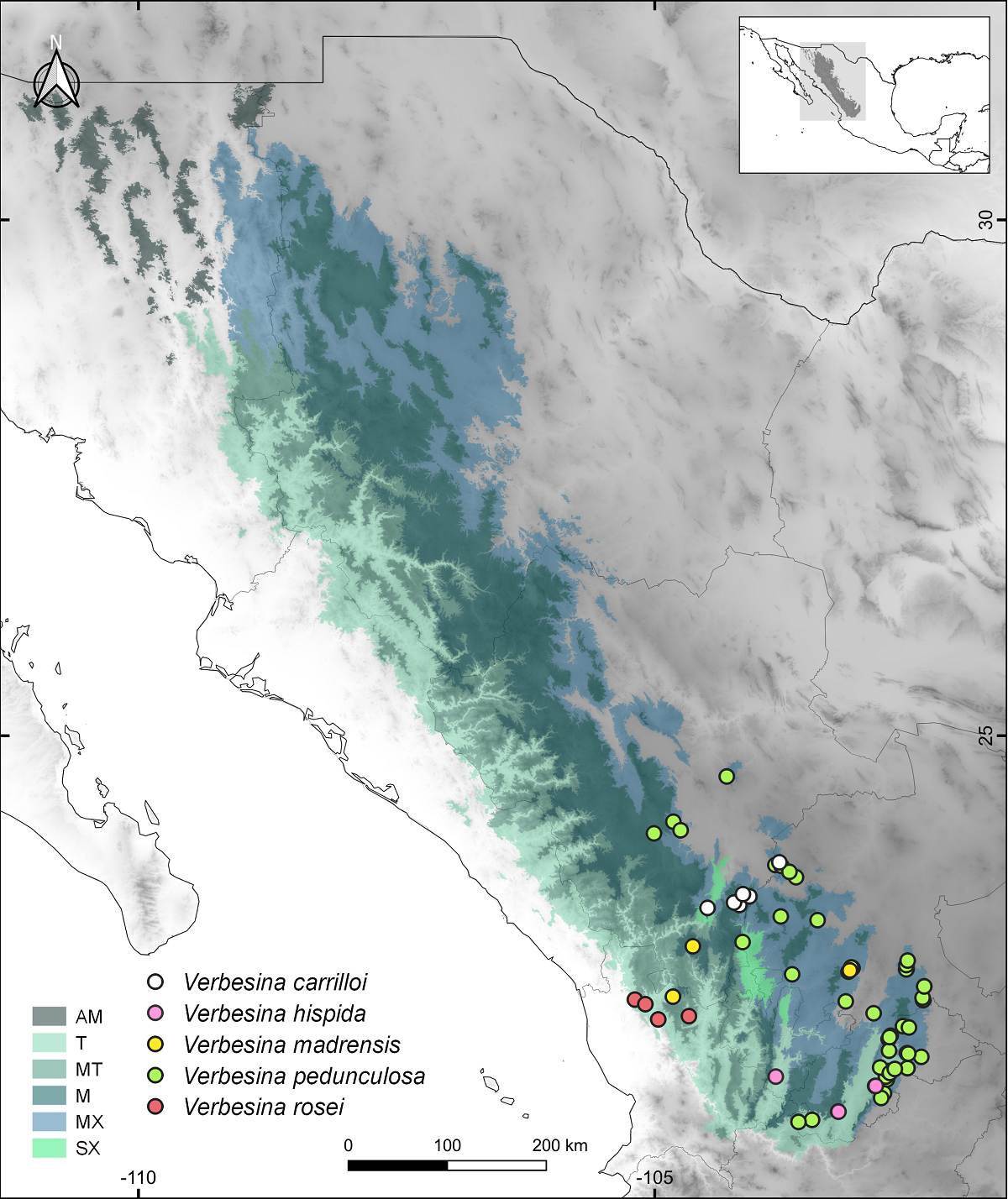 Análisis espacial. Los datos de distribución de las especies de Verbesina en SMOC fueron obtenidos tanto de la revisión de especímenes de herbario, como de la consulta de colecciones virtuales alojadas en la Southwest Environmental Information Network (SEINet) del sistema de manejo de contenidos Symbiota (Gries et al. 2014). Otras fuentes de información fueron la colección virtual del Herbario Nacional de México de la Universidad Nacional Autónoma de México (IBUNAM 2025), los materiales tipo alojados en Global Plants JSTOR (2024) y las imágenes de ejemplares disponibles en Tropicos (2024), (Material suplementario). Los datos de ocurrencia fueron analizados usando el programa QGIS v. 3.28.4 (www.qgis.org) para eliminar registros duplicados o con localidades ambiguas. Se empleó el método de Chapman & Wieczorek (2020) para calcular coordenadas geográficas de los registros que carecían de ellas, pero que contaban con descripciones claras de la localidad de recolecta. Los registros se proyectaron sobre una versión modificada de González-Elizondo et al. (2024) del polígono de la SMOC y las ecorregiones propuestas por González-Elizondo et al. (2012). Por último, se generaron los mapas de distribución.