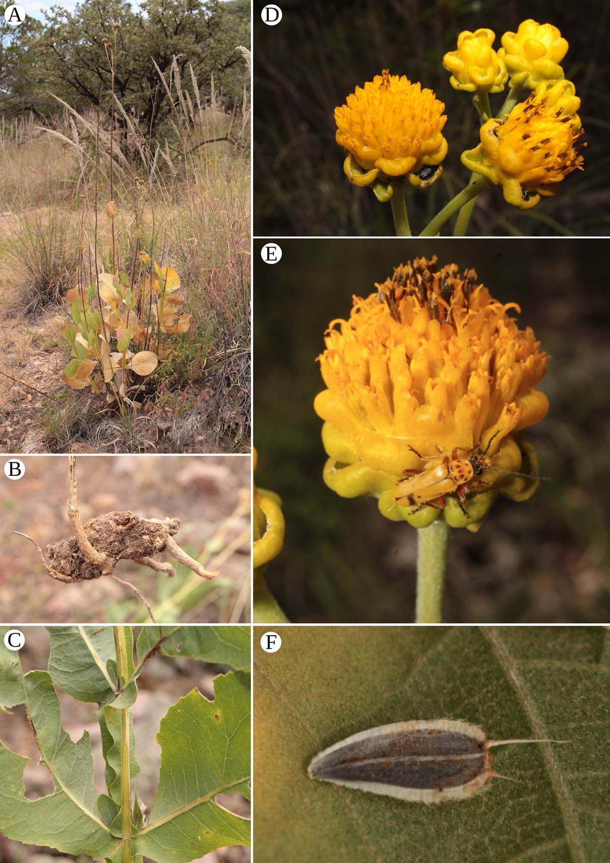 Figura 5 Morfología de Verbesina carrilloi Art.Castro & L.F.Colin-Nolasco. A) Hábito y hábitat. B) Detalle del rizoma engrosado. C) Vista del tallo alado. D-E) Vistas de los capítulos en distintos ángulos. F) Cipsela. Fotografías de Arturo Castro Castro.