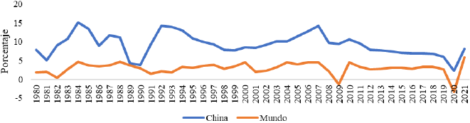 Figura 1 Evolución del porcentaje de crecimiento del PIB de China y el mundo (1980-2021)