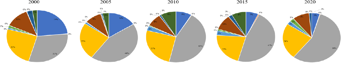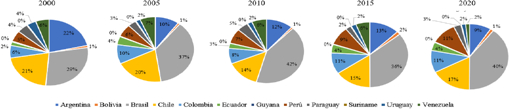 Figura 10 Distribución de las exportaciones de China con América del Sur, 2000-2020