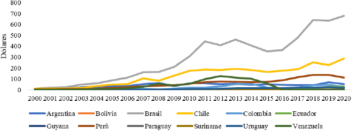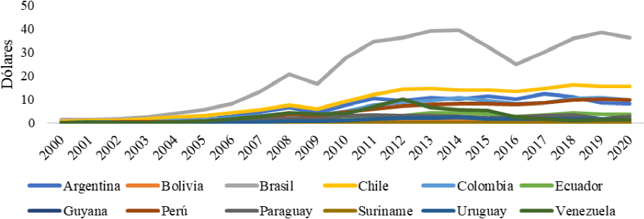 Figura 9 Evolución de las exportaciones de China a América del Sur en el siglo XXI
