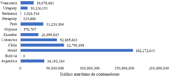 En la Figura 14 se examina el total acumulado de contenedores que han impulsado las economías de América del Sur. Destaca la cifra de más de 162 millones de contenedores transportados por Brasil, seguido por los 62 millones de Chile, 52 millones de Colombia y Perú, un país que ha experimentado un importante crecimiento en el comercio en el último siglo, alcanzando los 33 millones de contenedores.