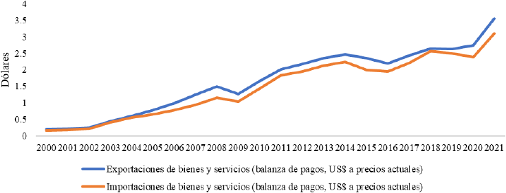 Figura 2 Evolución de las exportaciones e importaciones de China en el siglo XXI