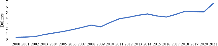 En cuanto al PIB per cápita, Argentina fue el país que menos creció, aumentando 1.4 veces. Su PIB per cápita en el año 2000 era de 7,708 dólares y en 2021 alcanzó los $10,729. En contraste, China experimentó un crecimiento de 13.1 veces, con un PIB per cápita de apenas 959 dólares en el año 2000 y $12,556 en 2021. En promedio, la zona de análisis experimentó un crecimiento de 3.2 veces en su PIB per cápita durante el periodo estudiado.