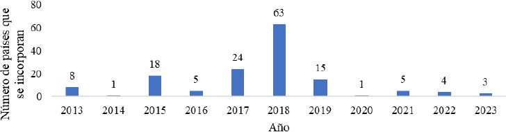 Figura 5 Evolución de la incorporación de los países a la BRI, 2013-2023