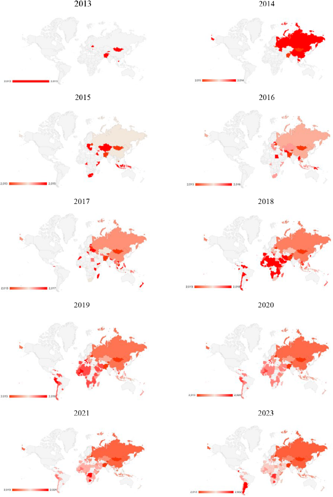 Por lo que respecta a la incorporación de los países al macroproyecto de la BRI, en la Figura 5 se detalla la evolución de cada país desde el año 2013, cuando apenas eran ocho naciones las pertenecientes a ella, y cómo el mapa cada vez se va pintando más y más de color rojo hasta llegar en 2023 a 147 naciones.