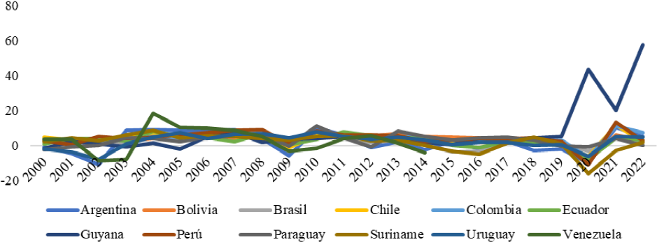 En 2018, América del Sur inicia su participación en la BRI, marcando un cambio en su trayectoria de crecimiento, como se ilustra en la Figura 8. Además, es importante mencionar que, en los años 2021 y 2022, la región experimentó un efecto similar al de la crisis anterior, con tasas de crecimiento superiores al 8 %. Se destaca la notable participación de Guyana, registrando un crecimiento del 20 % en 2021 y del 57.8 % para el año 2022.
