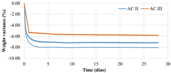 Both mortars show great weight variation in the first couple of days (with a variance of 5 to 8%), therefore, contrary to what was verified in the dimensional variation, the weight variation was greater for the type II adhesive mortars. Starting on the seventh day the variation of the two mortars began to stabilize, with little variance until the end of the test, in accordance to what is shown in Figure 3.