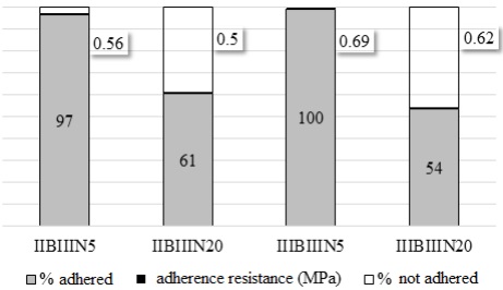 Considering the materials used, the only groups that reached the minimum adherence resistance to traction stipulated by the NBR 14.0891-1 (ABNT, 2012) were IIBIIaN, IIBIIbN, and IIBIIIN, all of which used the same adhesive mortar (AC II) and were subjected to the same type of curing (Normal).