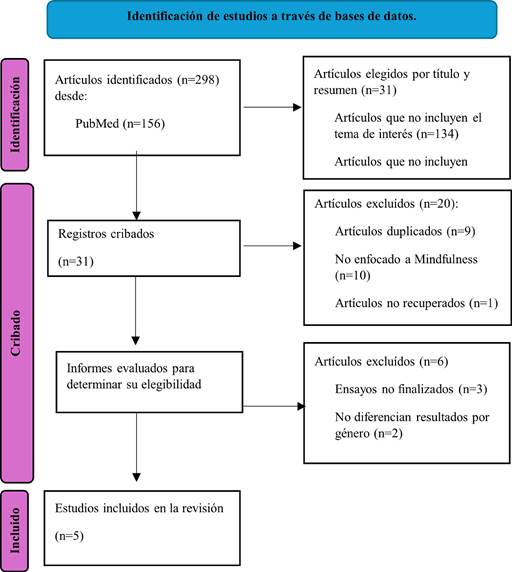 Se obtuvo un total de 298 artículos en todas las bases de datos utilizadas, manteniendo solamente 31 después de realizar la lectura de títulos y resumen. En la fase de cribado se excluyeron 19 y no fue posible la recuperación de un artículo. Seguido de esto se eligieron 11 artículos y fueron rechazados 6 de ellos tras la lectura de texto completo, debido a la falta de adecuación a la pregunta de investigación. Finalmente se incluyeron cinco artículos de los cuales se procedió a realizar un análisis crítico. En la figura 1 se muestra el diagrama PRISMA que reporta la identificación, la selección y la elegibilidad de cada estudio.
