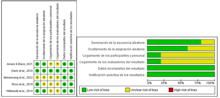 La evaluación de la calidad metodológica de los estudios fue alta, sin embargo, en la evaluación de riesgo de sesgo se identificó que cuatro estudios25,26,27,28 no describían claramente el cegamiento de los terapeutas que aplicaron la intervención. Así mismo, los cuatro estudios mencionados, no presentan la descripción del proceso del cegamiento de los participantes. En la figura 2 se muestran el resumen de riesgo de sesgo, así como el gráfico de la evaluación.