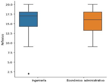 Por lo que respecta al EA reflexivo, se puede observar en la figura 2 que los datos se comportaron de la siguiente manera: en las dos áreas, la distribución de los datos es asimétrica; en la visión de económico-administrativa la mediana de los datos se encuentra alrededor de los 16 aciertos, a diferencia de las ingenierías, en las que existe una mayor dispersión entre el primer y segundo cuartil. Se identifica la existencia de un número mayor de alumnos reflexivos en las ingenierías.