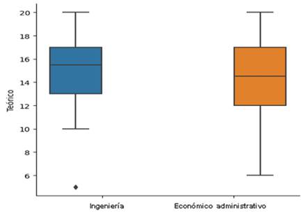 En el análisis del atributo teórico se puede observar, en la figura 3, que en el área económico administrativa, existe una mayor distribución en el primer cuartil, lo que indica que el 25% de los encuestados contestaron entre 6 y 13 aciertos. La mediana de alumnos de ingenierías y económico administrativa, en el baremo del cuestionario presenta una preferencia muy alta en este rubro.
