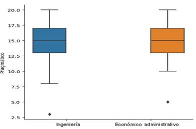 En el caso del atributo “pragmático” (ver figura 4), se encuentra que ambas muestras, ingenierías y económico administrativa, presentan una mediana de 15, cayendo en el baremo de preferencias como “alta”. Se acentúa una asimetría en el caso de ingenierías, donde se observa una mayor dispersión de datos en el 25% de los encuestados; es decir, hay una variabilidad de puntuaciones. Para el caso de económico administrativa se muestra una presentación casi simétrica.