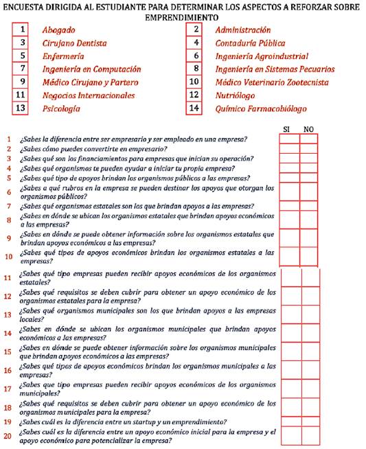 Una vez que se tuvieron concentradas las respuestas proporcionadas por los estudiantes que participaron llenando la encuesta, se pasó a la etapa de análisis. A través del análisis realizado, se descubrieron cuáles podrían ser los temas que requirieran dedicarles mayor refuerzo dentro del curso de Desarrollo de Proyectos de Emprendimiento e Innovación, que fue instrumentado para lograr la transversalidad en todas las licenciaturas que se imparten en el CUAltos, misma que deberá ser cursada en el séptimo semestre.