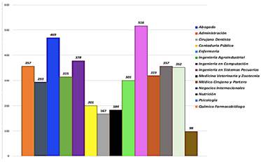 El porcentaje de participación de estudiantes de cada carrera llenando la encuesta fue: (1)Abogado 3.75%, (2)Administración 4.05%, (3)Cirujano Dentista 5.86%, (4)Contaduría Pública 6.31%, (5)Enfermería 9.46%, (6)Ingeniería Agroindustrial 3.3%, (7)Ingeniería en Computación 4.05%, (8)Ingeniería en Sistemas Pecuarios 14.56%, (9)Medicina Veterinaria y Zootecnia 6.46%, (10)Médico Cirujano y Partero 10.06%, (11)Negocios Internacionales 11.71%, (12)Nutrición 8.86%, (13)Psicología 11.56% y (14)Químico Farmacobiólogo 0%.