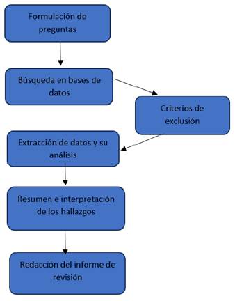 La revisión bibliográfica se llevó a cabo en concordancia con lo establecido por la versión de 2020 del marco de trabajo PRISMA (Moher et al., 2009), cuyas siglas significan Preferred Reporting Items for Systematic reviews and Meta-Analyses, que se puede traducir cómo Elementos de Informe Preferidos para Revisiones Sistemáticas y Meta-Análisis; el cual ofrece un enfoque de secuencia para recopilar, identificar, excluir y seleccionar aquellos artículos que guardan relación con el objeto de estudio, es decir, no se centra en contenidos sino en cómo fue desarrollada la búsqueda, tal como se presenta. El propósito de este método es apoyar a los autores en la presentación de reportes de revisiones sistemáticas y metaanálisis. De forma muy sintetizada en apego a la declaración de Page et al. (2021) en la Figura 1 se muestra el flujo establecido por PRISMA y adaptado a la presente investigación.