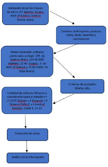 Una vez llevada a cabo la búsqueda en las tres bases de datos seleccionadas, e identificados los artículos potencialmente elegibles, debido a que contienen los términos previamente establecidos; se descargaron los artículos y de cada uno de ellos se analizó su título, resumen y conclusiones, con base en los criterios de exclusión, lo que permitió descartar varios artículos. En la sección de resultados se presentan los artículos que fueron considerados en el estudio, una vez que se eliminaron aquellos que no cumplieron con las condiciones requeridas. Los criterios de exclusión fueron los siguientes:
