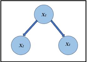 En la Figura 1 se muestra un esquema de una red bayesiana simple, en la que un círculo o elipse representan los nodos del grafo, dentro del círculo se muestran las variables identificadas como X1, X2, X3 , y la flechas, también denominadas arcos del grafo, indican las relaciones causales entre estas variables aleatorias. Por ejemplo, en este esquema, las variables X2 y X3 tienen una dependencia causal con la variable X1.