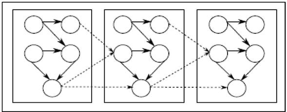 Las redes bayesianas no pueden representar con precisión la relación dinámica entre los parámetros de los procesos, sin embargo, se puede crear una red bayesiana dinámica para incorporar la influencia de la dimensión tiempo dentro de la red bayesiana (Mao, et ál., 2023). Las redes bayesianas dinámicas son una extensión de las redes bayesianas que modelan dominios desde una perspectiva temporal; en esencia, son redes bayesianas extendidas en el tiempo (Saada, Kouppas, Li, y Meng, 2022). Su mayor ventaja es que puede trabajar sin dificultad con datos inciertos o faltantes y sus resultados de predicción son confiables y razonables (Wei, Yu, y Li, 2023). Los intervalos de tiempo reflejan el cambio en el estado/probabilidades de los parámetros en el modelo. Las redes bayesianas dinámicas describen series de tiempo discretas que consisten en observaciones de variables a lo largo de múltiples instantes de tiempo llamados pasos de tiempo o intervalos de tiempo, se asume que el tiempo entre dos intervalos consecutivos es siempre el mismo. Según Leão et ál (2021), una red bayesiana dinámica es un par B0 , B͢ donde: