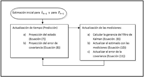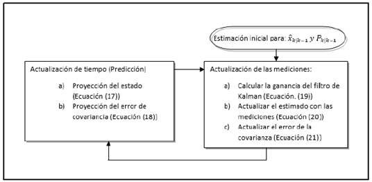 En la Figura 4 se muestra el diagrama de operación del filtro de Kalman extendido con las ecuaciones de actualización de tiempo y de medición.