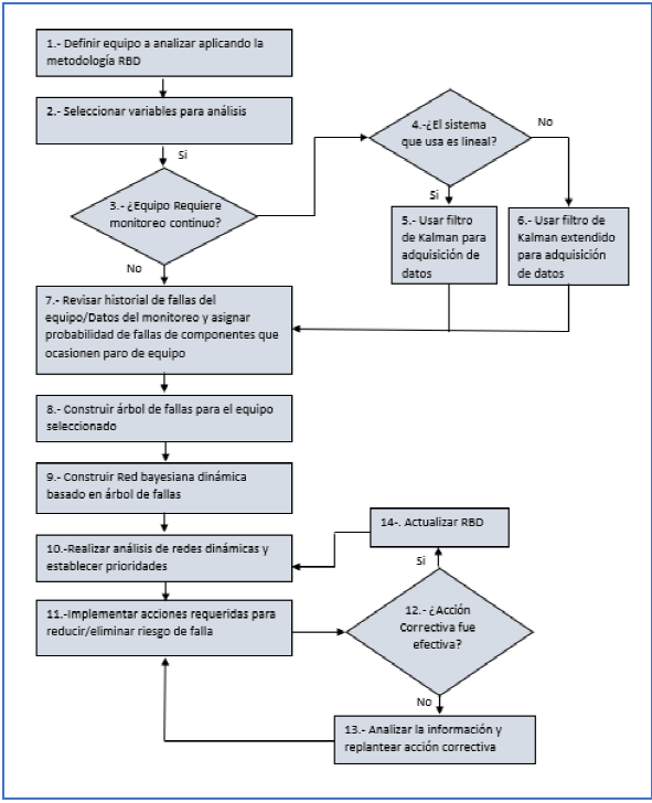 Como resultado del análisis realizado, se desarrolló una metodología para el análisis de fallas aplicable a cualquier equipo industrial incluido en un programa de mantenimiento, con el objetivo de mantenerlo en óptimas condiciones de operación. Esta metodología incorpora la técnica de redes bayesianas dinámicas, que permite evaluar la relación temporal entre los parámetros de los equipos y manejar probabilidades condicionales de falla, lo que facilita la priorización de acciones correctivas. Para los equipos que requieren monitoreo en tiempo real, se emplea el filtro de Kalman para incrementar la confiabilidad de los datos obtenidos.