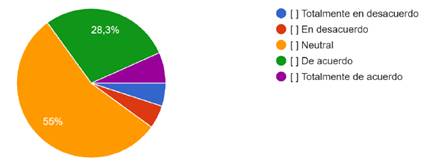 Los datos muestran que la mayoría de los estudiantes (48.3%) se mantienen neutrales respecto a la confianza en que las universidades implementen protocolos de seguridad adecuados para el uso de la IA, mientras que un 30% está de acuerdo y un 13.3% totalmente de acuerdo; por otro lado, un 8.3% se manifiesta en desacuerdo, lo cual sugiere que, si bien no existe un fuerte rechazo a la capacidad institucional para regular y proteger el uso de la IA, la mitad de la muestra aún no expresa una postura definida o sólida al respecto. Este resultado podría interpretarse como un indicador de que, aunque hay una aceptación razonable de la labor universitaria en la implementación de protocolos, sigue siendo necesario reforzar la comunicación y transparencia de dichas medidas, así como generar una mayor sensibilización sobre la importancia de la seguridad en el uso de herramientas de IA; de esta forma, las instituciones de educación superior podrían consolidar la confianza de sus estudiantes, promoviendo a la vez una cultura de responsabilidad y protección de datos que atienda los retos éticos inherentes al empleo de tecnologías emergentes.