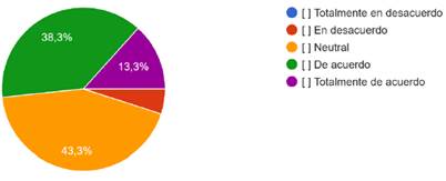 Los resultados evidencian que un 43.3% de los estudiantes se ubica en una posición neutral frente a su preparación para identificar riesgos éticos en el uso de la IA, seguido de un 38.3% que considera estar de acuerdo y un 8.3% que se muestra totalmente de acuerdo, mientras otro 8.3% se declara en desacuerdo y no se registran respuestas de “Totalmente en desacuerdo”; esta distribución sugiere que, aunque existe un grupo significativo que percibe contar con ciertas habilidades o conocimientos para reconocer potenciales problemas éticos, predomina una actitud de incertidumbre que podría deberse a la falta de formación específica o la escasa difusión de directrices institucionales claras. Por esta razón, se refuerza la importancia de diseñar programas de capacitación y difusión más efectivos en el ámbito universitario, de modo que se promueva una conciencia colectiva y una preparación sólida para trata los desafíos éticos que surgen en la adopción de tecnologías de inteligencia artificial.
