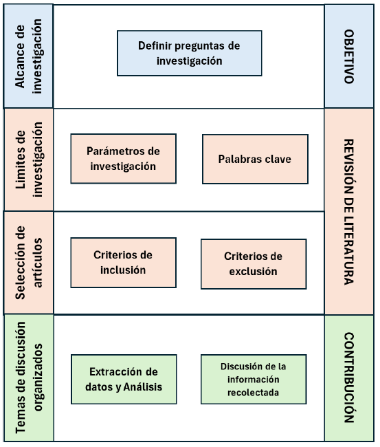 En la Tabla 1 se muestra el contenido detallado para el desarrollo de las etapas “alcance de investigación”, “límite de investigación” y “selección de artículos”, de acuerdo con el método propuesto.