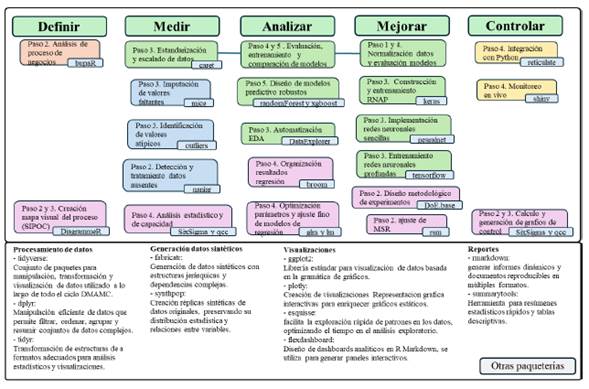 La Figura 10 muestra las librerías de RStudio necesarias para el desarrollo de las actividades correspondientes al EIS, se destaca el uso de DiagrammeR - para creación de diagramas y gráficos de flujo - que dentro de la fase de Definir permite el mapeo del proceso, así como la generación estructural del SIPOC. Asímismo, outliers, caret y mice - detección de valores atípicos, normalización e imputación de datos faltantes - se utilizan para llevar a cabo las técnicas de MD dentro de la fase de Medir, mientras que qcc lleva a cabo el análisis de capacidad. En la fase de Analizar se destaca DataExplorer - para análisis exploratorios de datos - previo al manejo de los modelos de regresión y predicción llevados a cabo por un lado con lm y glm -para ajustar modelos de regresión - y por el otro con caret y randomForest - para entrenamiento y construcción de modelos predictivos -. Para la fase de Mejorar son clave rsm y DoE.base - para desarrollo de MSR - junto con keras y tensorflow - para la implementación de RNP -. Por último, en la fase de Controlar se pueden mencionar qcc (análisis de capacidad y gráficos de contorl) y shiny - para la creación de gráficos de control y monitoreo en tiempo real. Esta información aporta una base técnica que sirve como guía para el desarrollo de este SMCA.