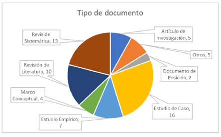 Información general es extraída, tal como se muestra en la Figura 4 la cantidad de publicaciones son similares en el periodo analizado. ScienceDirect es la plataforma con más documentos (17), seguida de Taylor & Francis (16) y Springer (12). La Figura 5 indica que la mayoría de los documentos son de tipo estudios de caso (16), seguido por revisiones sistemáticas (13) y revisiones de literatura (10).