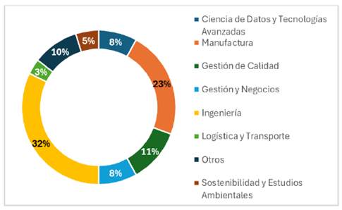 La Figura 6 presenta la distribución disciplinaria de los 62 artículos analizados, la mayoría se concentra en Ingeniería (32%) seguida de Manufactura (23%), disciplinas donde el uso de DMAIC es más común y donde la integración con HAAD es más prometedora. Esta distribución valida el enfoque hacia el sector industrial del estudio y destaca cómo estas disciplinas lideran la investigación de SMCA´s.