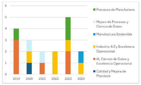 En total 18 artículos se seleccionaron, la Figura 7 muestra la distribución temporal y de área de investigación, se destaca (1) IA, ciencia de datos y excelencia operacional (seis documentos), que abordan técnicas analíticas puras y (2) I4.0 y excelencia operacional (cinco documentos), enfocadas en implementación tecnológica.