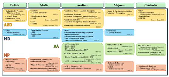 Este trabajo busca responder a la pregunta: ¿Cómo se integran las HAAD con las herramientas de la metodología DMAIC dentro de las mejoras de procesos industriales? tradicionalmente la literatura de aplicaciones reporta el uso de las herramientas clásicas de DMAIC -como las siete herramientas básicas, el diseño de experimentos (DDE) y regresión lineal- (Abd Elnaby et al., 2024; Raut, 2020; Yang et al., 2021). Sin embargo, estudios recientes muestran un creciente interés por integrar las técnicas especializadas HAAD -como agrupamiento (del área AA), descubrimiento de procesos (del área MP), o K-medias (del área MD)- (Antony et al., 2019), cuya sinergia permite, por ejemplo: (1) en Definir, usar la técnica de Agrupamiento (área MD) para identificación de problemas; (2) en Medir, Identificar puntos de mejora por medio del análisis predictivo (área ABD); (3) en Analizar, Identificar causas raíz a través de descubrimiento de procesos o verificación de conformidad (VC); (4) en Mejorar, optimizar procesos a través de AA - árboles de decisión o análisis de componentes principales -; (5) Por último, en Controlar utilizar el monitoreo en tiempo real (área ABD) para monitorear el rendimiento y asegurar que las mejoras se mantengan a lo largo del tiempo. Estos son solo algunos ejemplos de las técnicas que pueden ser utilizadas dentro de las fases de DMAIC (Maged et al., 2024; Tissir et al., 2023).