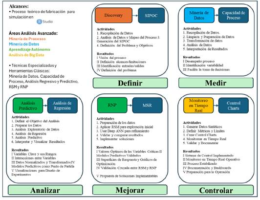 En la fase de Definir (SIPOC-descubrimiento de procesos) el vínculo permite delimitar el problema e identificar las entradas y salidas del proceso de manera automática, esta información es usada en la fase de Medir (MD-capacidad de proceso (Cp, Cpk)) donde las técnicas de Minería de Datos (p. ej. Detección de valores atípicos, normalización y escalado de datos, etc.) identifican patrones críticos y prepara los datos para el análisis de capacidad, este cuantifica el cumplimiento actual del proceso y establece una base métrica que sirve para la fase de Analizar (análisis predictivo-análisis de regresión) donde se modelan relaciones entre variables mediante regresión para entender su impacto y se entrenan modelos predictivos -como bosque aleatorio, regresión logística y RNA - para anticipar comportamientos del proceso. Después, en la fase de Mejorar (RNP-MSR) se utilizan las variables identificadas en la fase anterior para encontrar los valores óptimos y se potencia con el uso de la RNP para refinamiento de búsqueda de valores y definición de relaciones complejas. Por último, en la fase de Controlar (monitoreo en tiempo real-gráficos de control) la vinculación permite establecer un sistema de monitoreo con datos actuales del proceso donde el gráfico de control mantiene el proceso dentro de lo establecido.