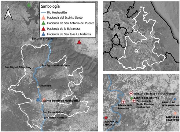 Figura 1. Ubicación de poblaciones, ex-haciendas, iglesias, barrios y el municipio de Huehuetlán el Grande en el estado de Puebla, México. Fuente: Mapa elaborado con base en trabajo de campo etnográfico en Huehuetlán. Generado por Carlos Santiago Vázquez en el programa Qgis con fundamento en datos del Instituto Nacional de Estadística y Geografía (INEGI).