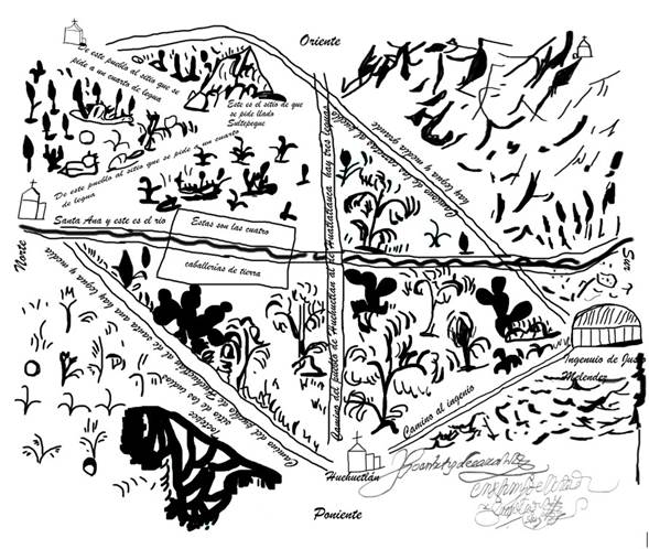Figura 2. Territorialidades de Huehuetlán en el siglo XVIII. El mapa exhibe una merced que Tomás Peña solicitó en 1620 para el establecimiento de un sitio de ganado en los términos de Huehuetlán el Grande. Fuente: Dibujo realizado por María Paola San Martín Sánchez (2022) en el programa Photoshop con fundamento en el mapa “Gueguetlán, Guatlatlauca. Pue. Mapa, soporte papel con dimensiones de 31 x 41.5 cm”, localizado en el Archivo General de la Nación / Instituciones Coloniales / Colecciones / Mapas, Planos e Ilustraciones (280).
