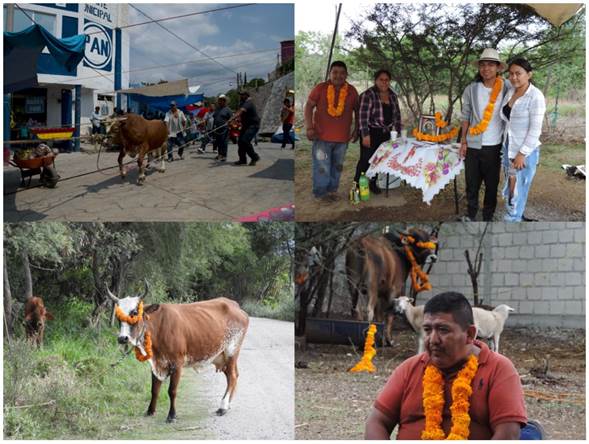 Figura 3. Al lado superior izquierdo: Toro donado durante la fiesta del Niño de Huehuetlán. El donante con otros hombres presenta al bovino frente al atrio del templo antes de realizar el sacrificio para que la carne sea preparada en mole con verduras. Al lado superior derecho: altar en honor a san Lucas Evangelista y familia de ganaderos. Al lado inferior izquierdo: toro enflorado localizado en el camino hacia el barrio de Coatepec. Al lado inferior derecho: Dueño del ganado luciendo su collar de flores de cempasúchil. Fuente: Leticia Villalobos Sampayo (2015; 2022). Huehuetlán el Grande, Puebla.