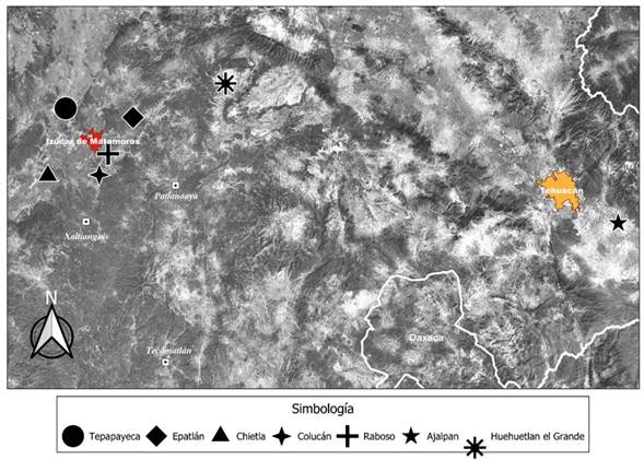 Figura 4 Región de la “Danza” o “El Baile” de los Vaqueros en el estado de Puebla. Fuente: Mapa realizado por Carlos Santiago Vázquez (2022) en el programa Qgis con base en resultados de proyectos Tepapayeca-INAH del 2021-2018 y del trabajo de campo etnográfico en Huehuetlán, con fundamento en datos del Instituto Nacional de Estadística y Geografía (INEGI).