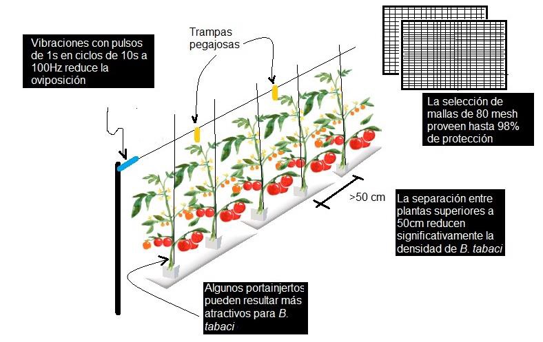 Entre las estrategias de control de la mosquita blanca, las más importantes son las que se ejercen antes de la plantación. Los invernaderos con ventanas frontales y cenitales y ventilas cubiertas con mallas antiáfidos proporcionan una alta protección contra los adultos de mosquita blanca y reducen los problemas de virus transmitidos por esta plaga. Se comprobó recientemente que esta protección, en conjunto con el acolchado plástico aluminizado reflectivo como cubierta de suelo, logra mejores resultados de control [7]. Esto se debe a que la reflectividad del material del suelo provoca desorientación a los insectos voladores. El empleo de materiales plásticos producidos con tecnología reciente presenta como característica principal una alta capacidad absorbente o bloqueadora de radiación UV, con lo cual se registran reducciones significativas en la densidad poblacional de mosquita blanca en comparación a los plásticos convencionales [8].